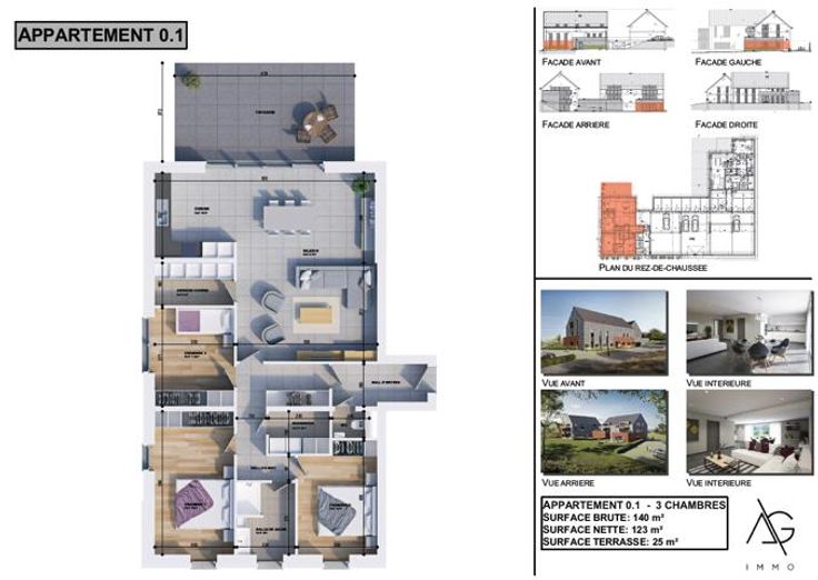 Idéalement situé, dans le village très recherché de Nandrin, superbe appartement de 3 chambres de 140 m² avec grande terrasse de 25 m² et jardin privatif. L'appartement se compose d'un hall d'entrée avec WC séparé, un grand séjour avec cuisine ouverte, une arrière-cuisine, 3 chambres, une salle de douche et une buanderie. Finitions haut de gamme, ascenseur, isolation thermique et acoustique soignée. Le prix inclut cuisine équipée complète, revêtements de sol (carrelage et/ou parquet). Possibilité d'acquérir une cave et un emplacement de parking privatif intérieur ou extérieur en supplément. Paiement à la livraison (prévue 2026). Vente sous régime TVA 21%.