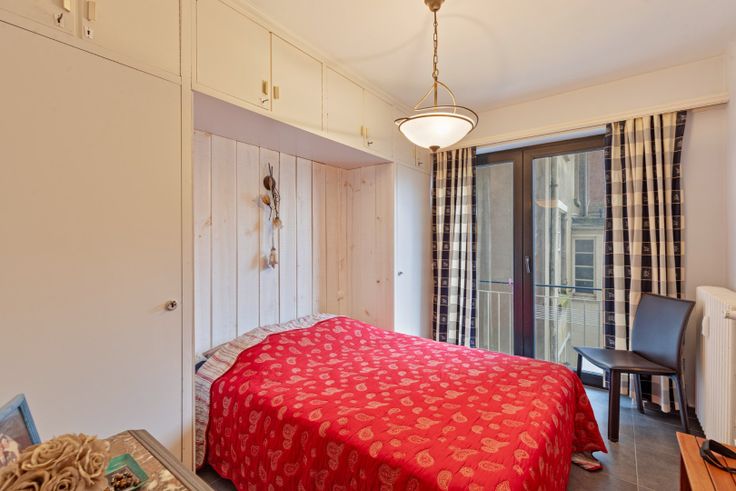 Ruim appartement op de 1ste verdieping van de residentie Madona op de Zeedijk van De Panne. Het appartement biedt u: inkomhall, woonkamer (6,13m breed) met open keuken en prachtig uitzicht op zee, nachthall met wc, badkamer met ligbad en lavabo, 2 slaapkamers. Bijhorende kelder in de ondergrondse. Gebouw met centrale verwarming.