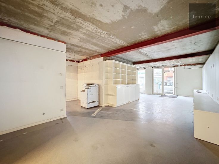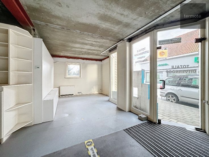 Vooraan handelsruimte van 75m² (10m60 diep x 7m50 breed) met inbouwkasten, bureel, toilet en etalage
