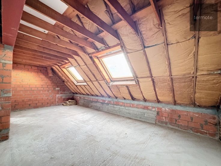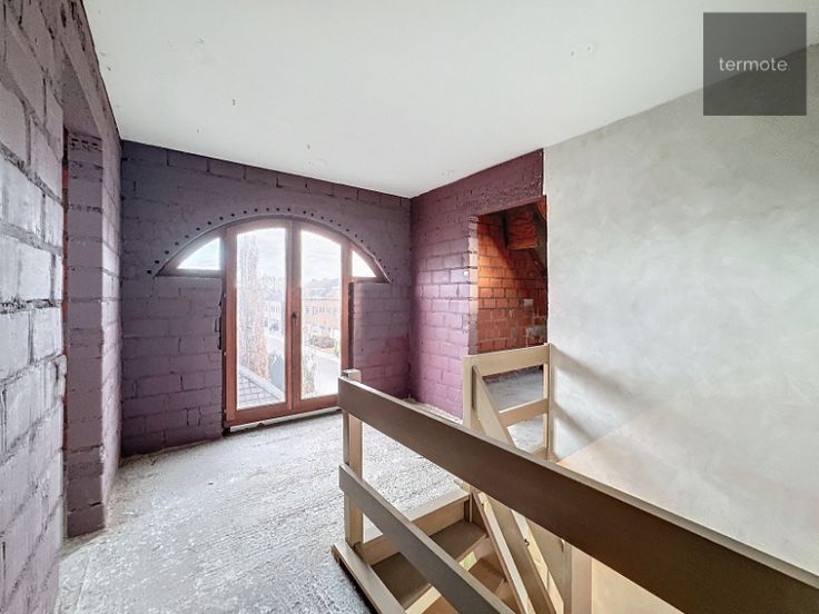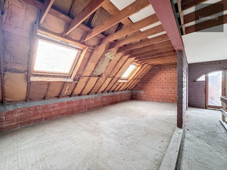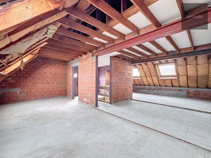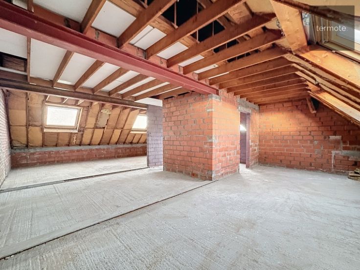 2e V : onafgewerkte ruimte van 9m op 7m70 = 70m² (volgens plan : hall, 3 slaapkamers en badkamer (+ nog ruime zolder erboven)
