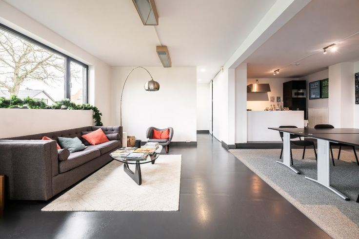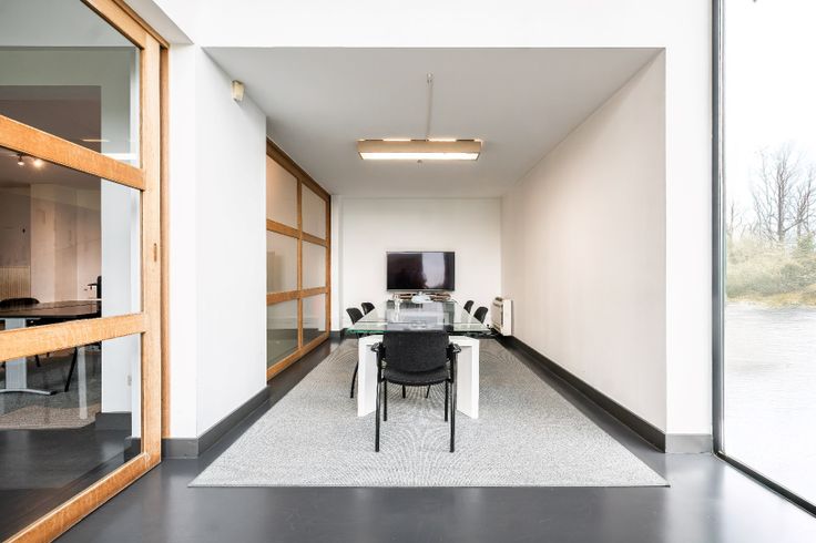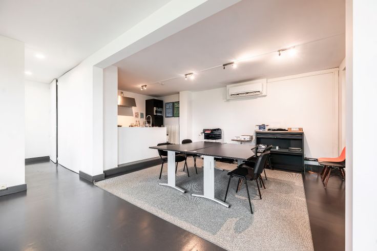 Op het gelijkvloers bevindt zich een stijlvolle inkomhal die leidt naar een ruime keuken met eetruimte en een aangrenzende lounge. Daarnaast zijn er twee afgesloten vergaderruimtes, waarvan één met een zithoek en de andere met een berging, ideaal voor meetings of vertrouwelijke gesprekken.