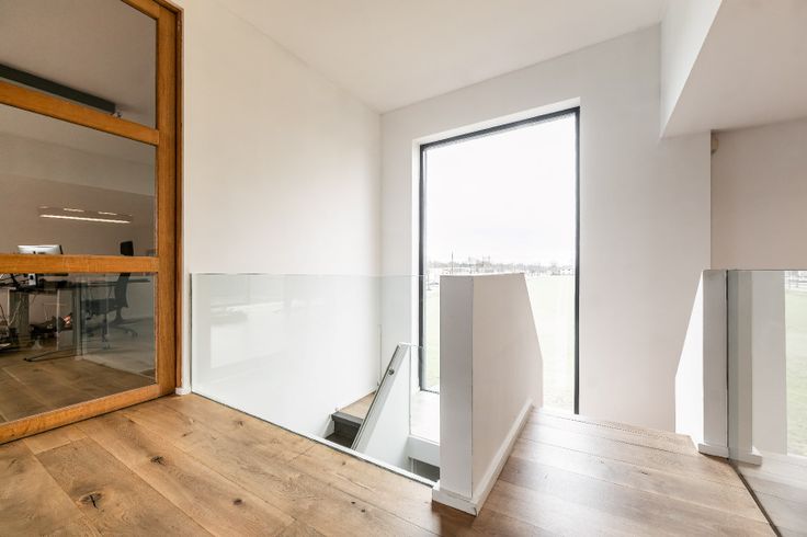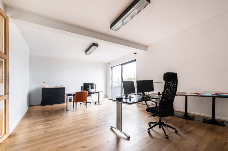 Op de bovenverdieping verwelkomt een open inkomhal u in een moderne werkomgeving met een ruime open kantoorruimte, een afgesloten bureauruimte en nog een extra open kantoorruimte, wat flexibiliteit biedt voor diverse werkopstellingen.