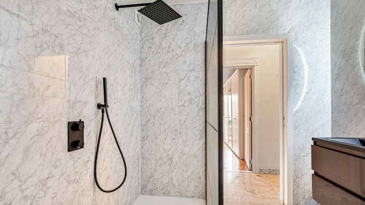 Een badkamer met lavabomeubel en regendouche, met aanpalende berging