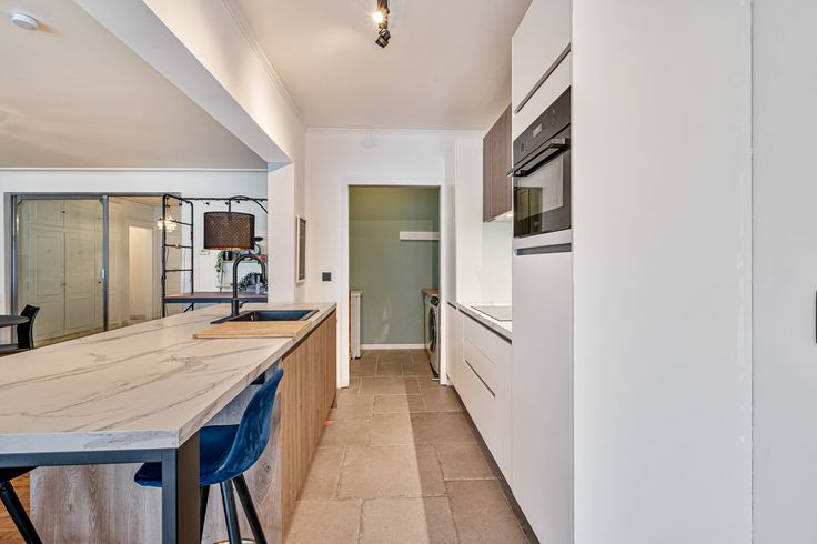 Bij binnenkomst in de ruime inkomhal met ingebouwde kasten leidt een doorgang naar links je meteen naar de lichtrijke leefruimte met open keuken en eiland. Deze ruimte vormt het hart van het appartement en biedt een aangename, open indeling. De volledig ingerichte keuken beschikt over een ingebouwde kasten, oven, frigo, vaatwas, voldoende opbergruimte en een aanpalende berging met plaats voor een wasmachine en droogkast.