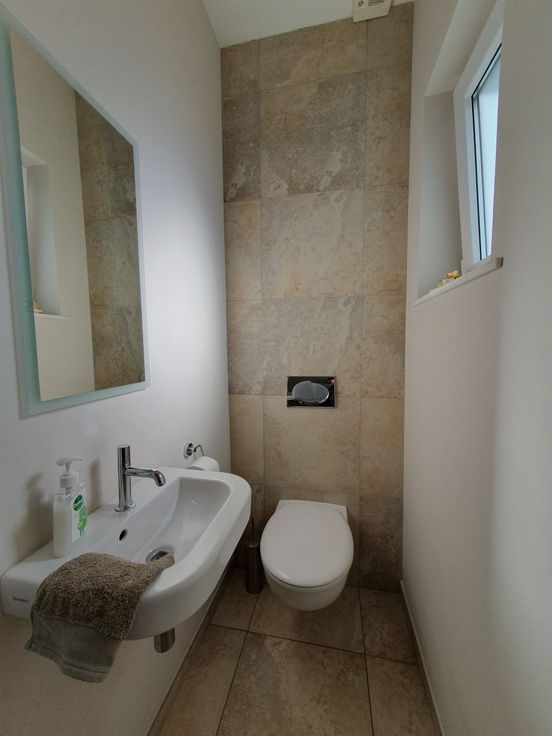 Gelijkvloers : inkomhal, WC, berging met aansluiting voor wasmachine/droogkast en nutsvoorzieningen, living met open hyper uitgeruste keuken en een extra berging onder de trap.