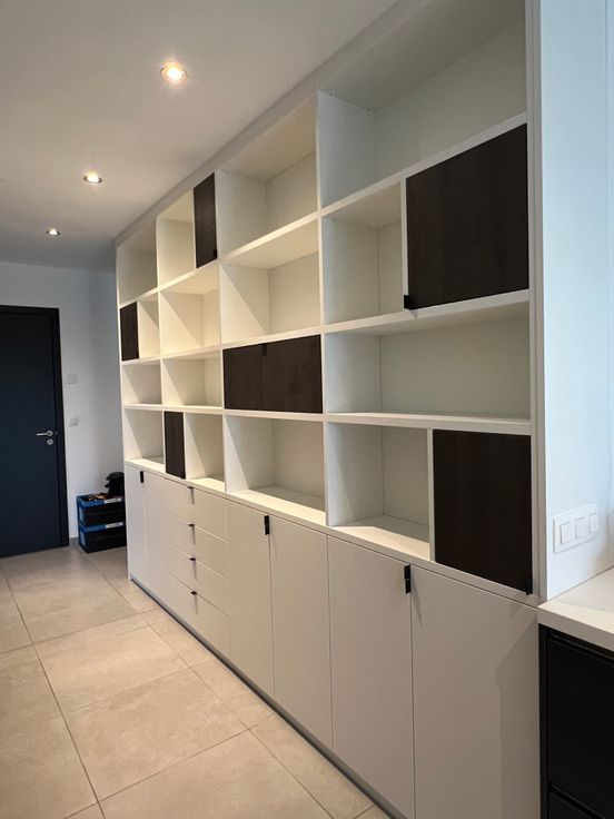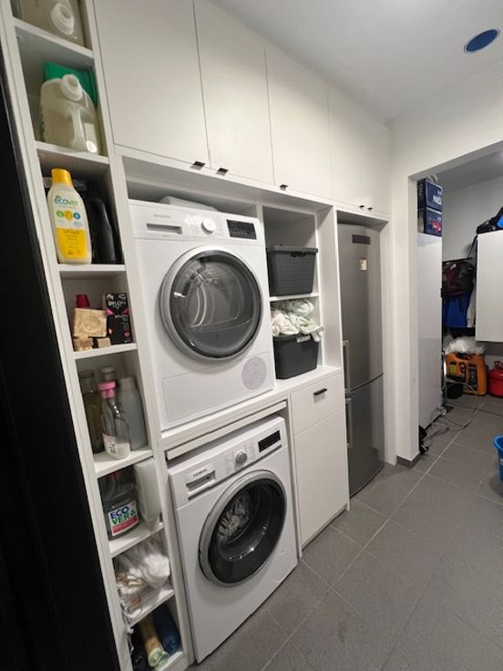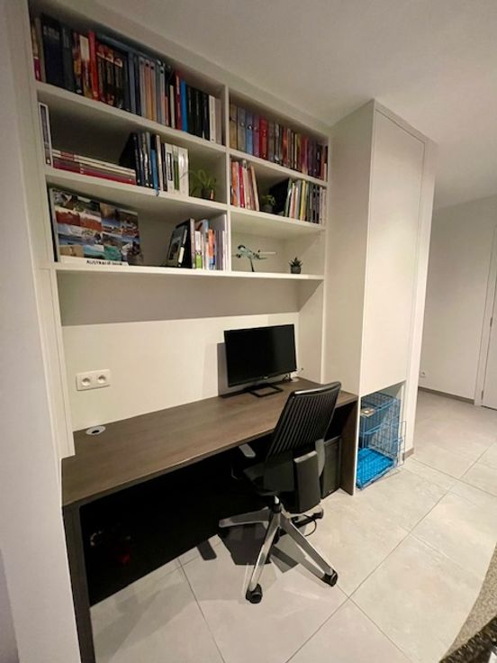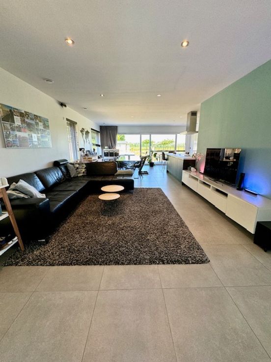 GELIJKVLOERS: Inkomhal met ingewerkte vestiaire en aparte toilet. Via een glazen deur krijg je toegang tot een grote open leefruimte waar living, eetplaats, keuken en bureau naadloos in elkaar overlopen.De leefruimte wordt achteraan de woning afgesloten met een groot schuifraam waardoor je een fantastisch zicht hebt op de tuin en de Kobbegemse velden. Moderne keuken met groot kookeiland (3 zitplaatsen). Volledig uitgerust met Siemens toestellen (inductieplaat, oven, microgolf, warmhoudlade, vaatwasser, koelkast van 1m90). Half afgesloten bureau ruimte met een op maat gemaakte bibliotheekkast. Dubbele berging aanwezig met op maat gemaakte wandkast voor wasmachine, droogkast en koelkast.