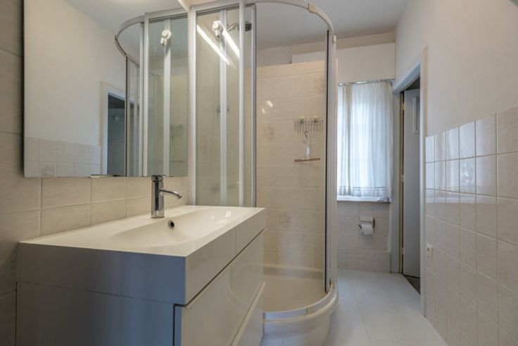 We komen binnen via een inkomhal die toegang geeft tot enerzijds de lichtrijke leefruimte en anderzijds de vernieuwde, volledig geïnstalleerde keuken. Verder vinden we op het gelijkvloers nog een apart toilet, een ruime berging en een veranda terug.