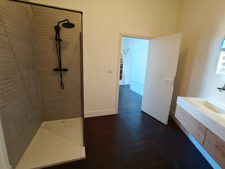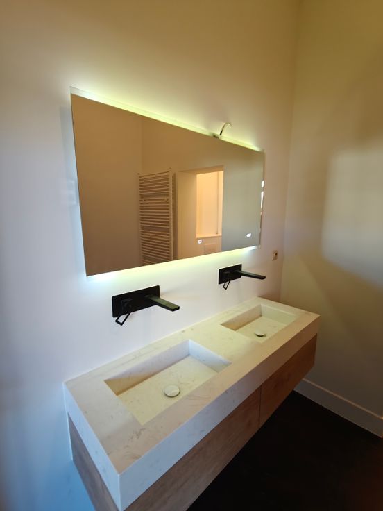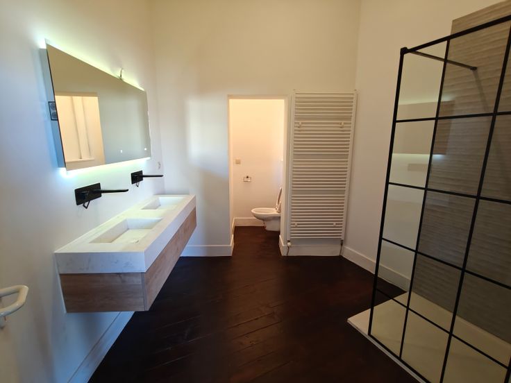Moderne badkamer met inloopdouche en dubbele wastafel