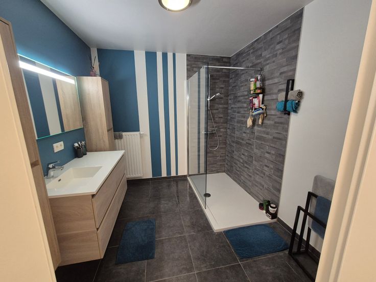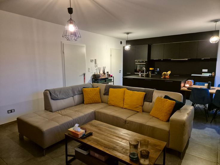 Appartement 1 chambre avec jardin à louer à Stockay (Saint-Georges). Situé dans une rue calme, l'appartement est au rez-de-chaussée avec jardin. Il est composé d'un salon avec cuisine ouverte (équipements Bosch : frigo, congélateur, taque induction, four, lave-vaisselle), 1 chambre, 1 salle de douche, toilette séparée, une buanderie avec possibilité de mettre machine + séchoir, une cave externe, 2 emplacements de parking. La résidence bénéficie également d'un grand jardin commun et d'un local poubelles séparé des logements.