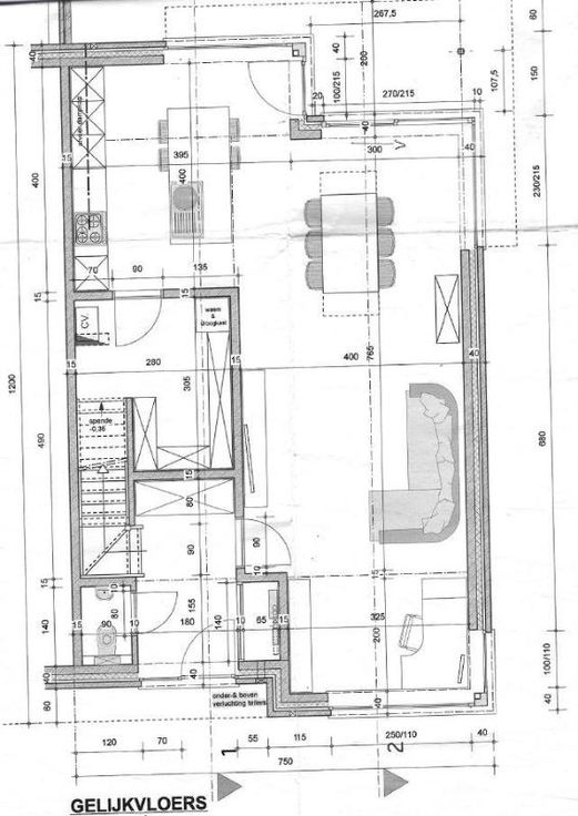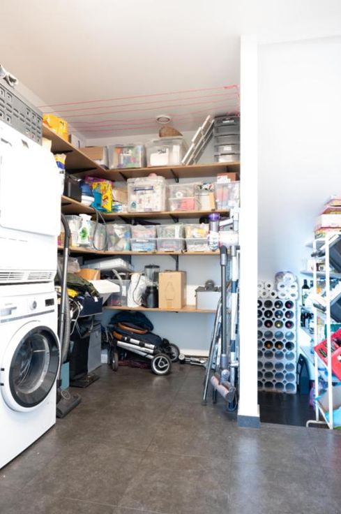 Gelijkvloers: inkomhal, toilet, woonkamer, open keuken, ruime berging voor wasmachine en droogkast, bureauruimte. De keuken is voorzien van een eiland, vaatwas, oven en inductie kookplaat en heeft uitzicht op de tuin. Alle ruimtes op gelijkvloers worden verwarmd met vloerverwarming.