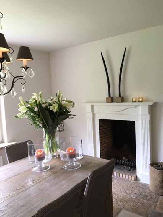 inkomhal met vestiaire, via glazen deur naar traphal met opbergruimte. Living met open haard en erker, gescheiden eetkamer met open haard.