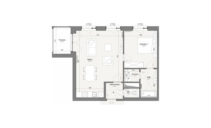 Descriptif général : Hall d'entrée, séjour avec cuisine ouverte, terrasse, 1 chambre, salle de bain avec baignoire, meuble vasque et miroir LED, buanderie, wc séparé et ascenseur