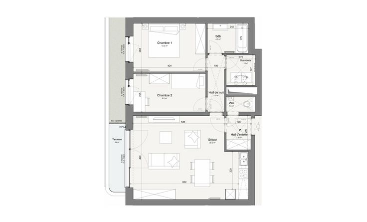 Descriptif technique : toits végétalisés, châssis PVC double vitrage à coupure thermique, système de chauffage collectif avec chaudière gaz individuelle, radiateurs, thermostat, ventilation double flux avec récupération de chaleur, carrelage à choisir avec plinthes assorties sauf pour les chambres, faïences toute hauteur autour de la baignoire, détection incendie, vidéo-parlophonie, terrasse avec pavés béton