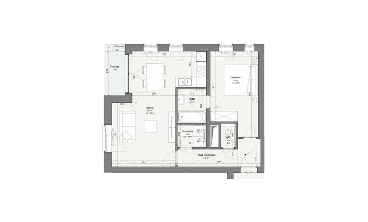 Descriptif général : Hall d'entrée, séjour avec cuisine ouverte, terrasse, 1 chambre, salle de bain avec baignoire, meuble vasque et miroir LED, buanderie, wc séparé et ascenseur