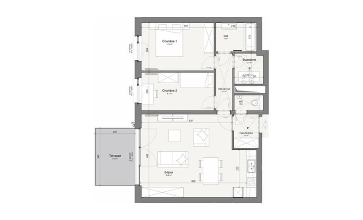 Descriptif général : Hall d'entrée, séjour avec cuisine ouverte, terrasse, 2 chambres, salle de bain avec baignoire, meuble vasque et miroir LED, buanderie, wc séparé et ascenseur