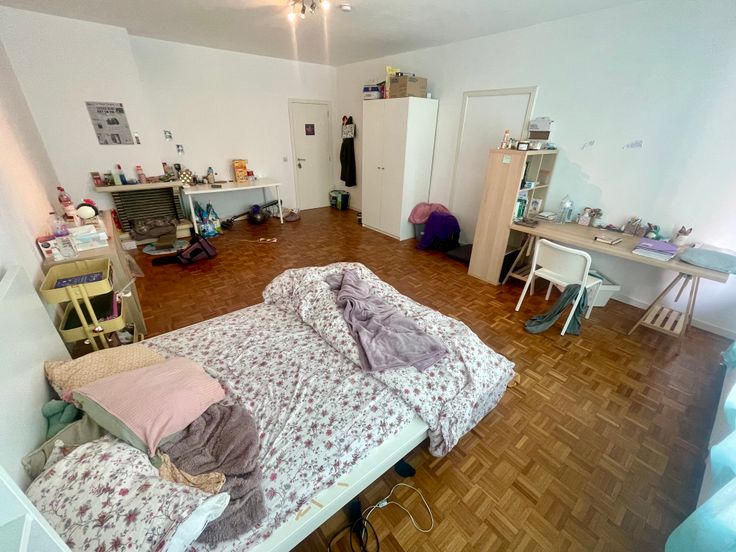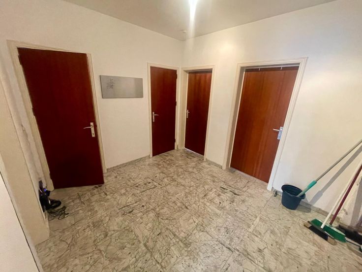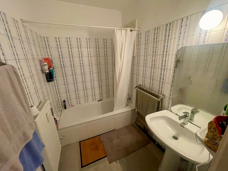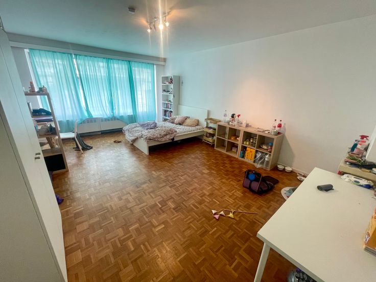 Hall d’entrée de 9m2 avec en face, la sdb et le wc séparé. 2 chambres donnant sur l’arrière dont une avec un balcon. Côté rue, une très grande chambre + cuisine et un balcon sur toute la longueur.
