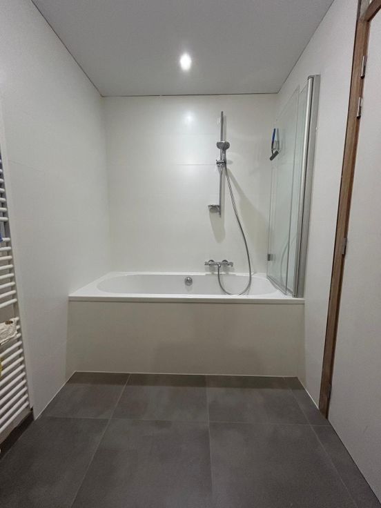 Badkamer voorzien van bad met douche-voorziening.