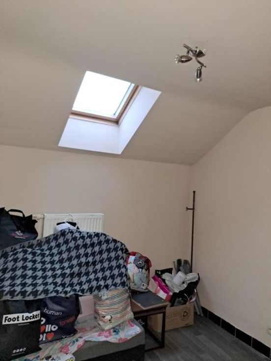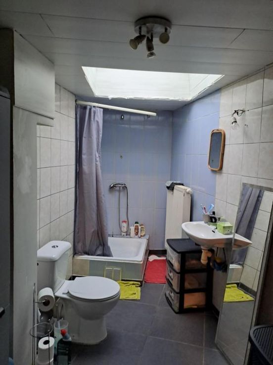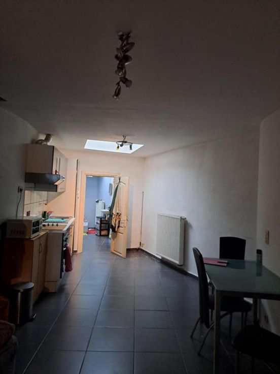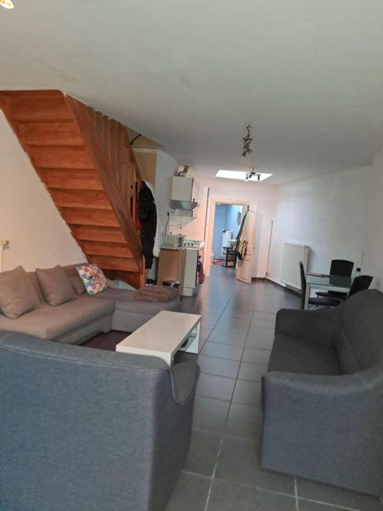 Maison comprenant : REZ : salon, salle à manger, cuisine, salle de bain (wc, douche, lavabo). ET : 2 chambres (dont une sur l'avant avec châssis en double vitrage et une communicante munie de velux). DIVERS : châssis double vitrage PVC, chaudière au gaz, pas de cave.