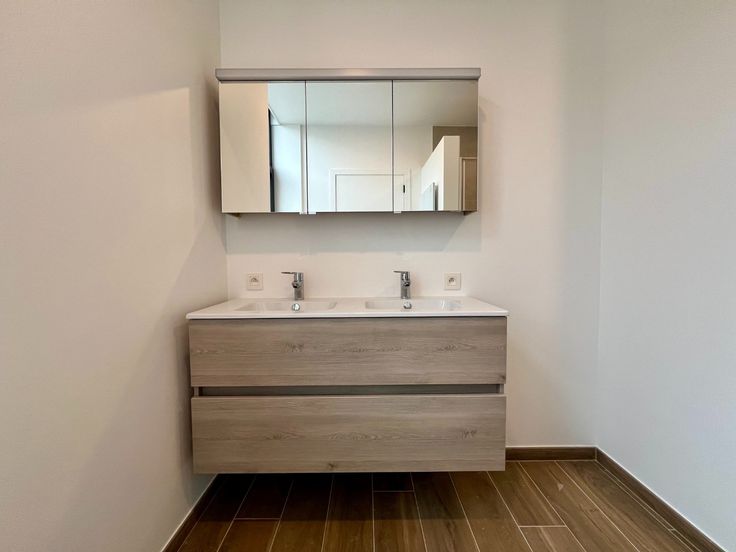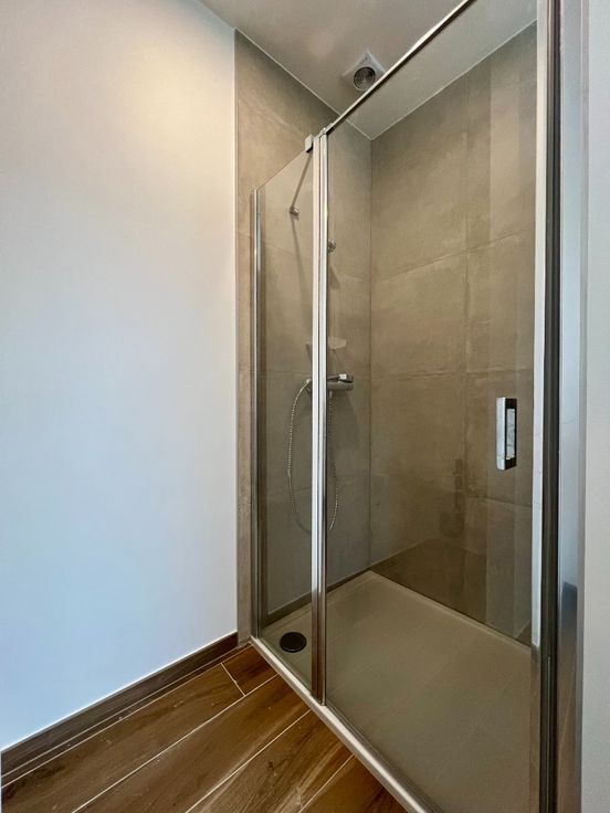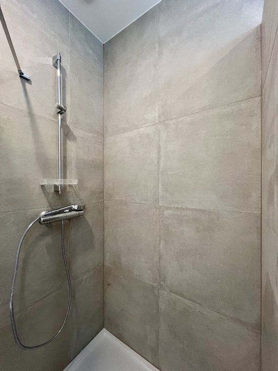 De badkamer is eveneens op het gelijkvloers gelegen en beschikt over een inloopdouche, dubbele wastafel en een handige wasruimte.