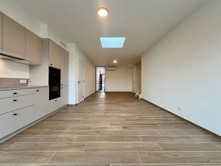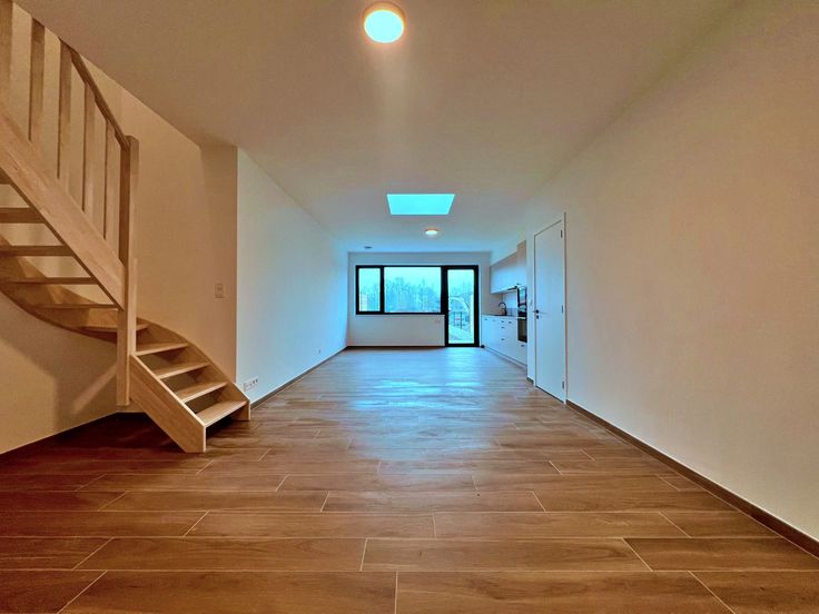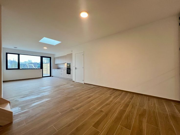 Achteraan de woning ligt een ruime tuin met een aangelegd terras, perfect voor buitenleven en ontspanning. Achter de tuin is bovendien een privatieve parkeerplaats voorzien.