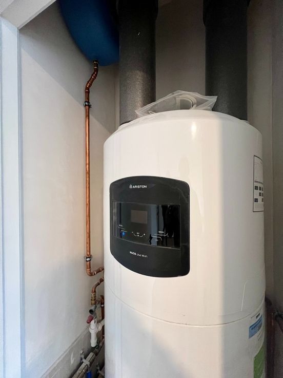 Warm water wordt geleverd door een warmtepompboiler.