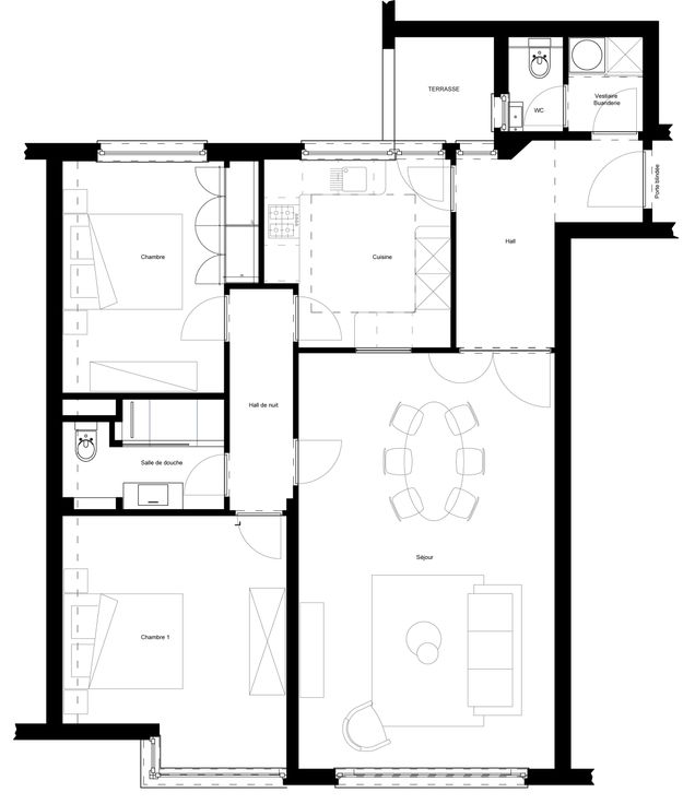 Composé d'un hall d'entrée généreux, un espace vestiaire/buanderie donnant accès à un toilette invité, séjour lumineux de 30 m² avec parquet restauré, d'une cuisine Hyper équipée avec accès à un balcon.