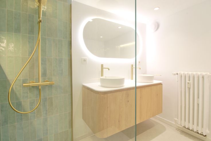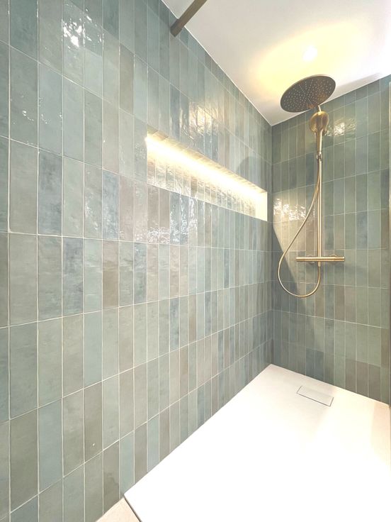 • Badkamer (±6m²) met inloopdouche, dubbel wastafelmeubel en toilet.