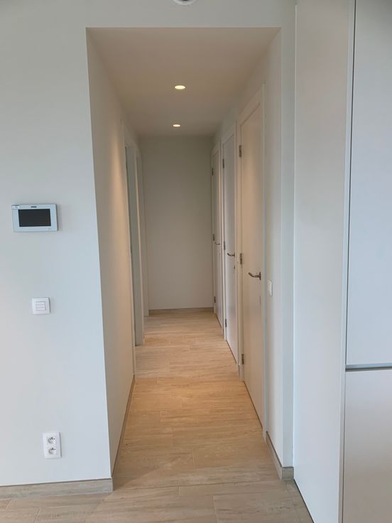 De indeling bestaat uit een grote leefruimte met volledig uitgeruste keuken met kook-en eeteiland met ingebouwde toestellen: combi-oven, microgolfoven, inductie kookplaat, vaatwasmachine, frigo en aparte diepvries, design plafonddampkap en ingebouwde vestiaire. Verder beschikt het appartement over 2 slaapkamers, badkamer met dubbele lavabo, voldoende opbergkasten onder en bovenaan met verlichte spiegel en inloop regendouche, apart toilet met wasbakje, berging met plaats voor was-en droogkast. In alle ruimtes is er hedendaagse verlichting en spots voorzien.