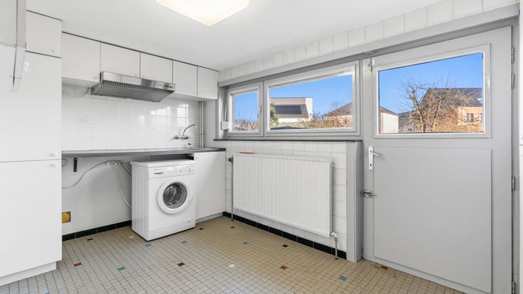 Via een halve trap bereikt u de drie slaapkamers; één is ingericht als sanitaire ruimte met extra toilet, terwijl de overige twee elk 16 m² beslaan. Op de begane grond vindt u een ruime garage met sectionale poort en toegang tot de kelder, alsmede een gerenoveerde badkamer en wasplaats met kasten.