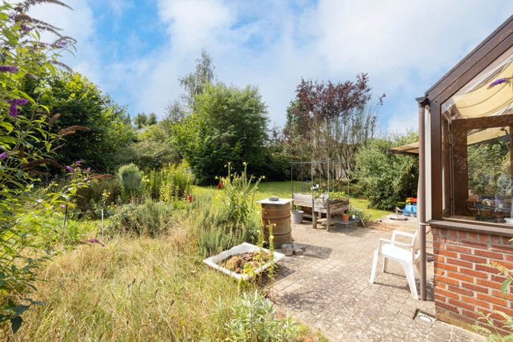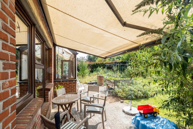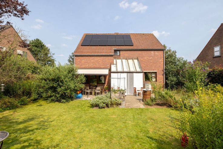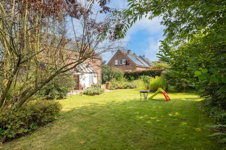 Oprit voor 3 wagens; zuidgericht, volledig omheinde en gezellige tuin met tal van mogelijkheden; beklinkerd terras met zonnewering; tuinhuisje.