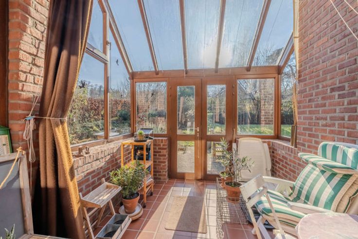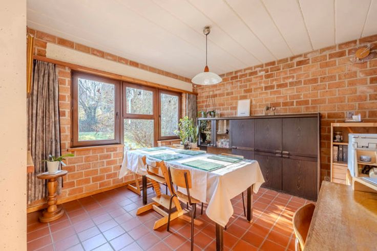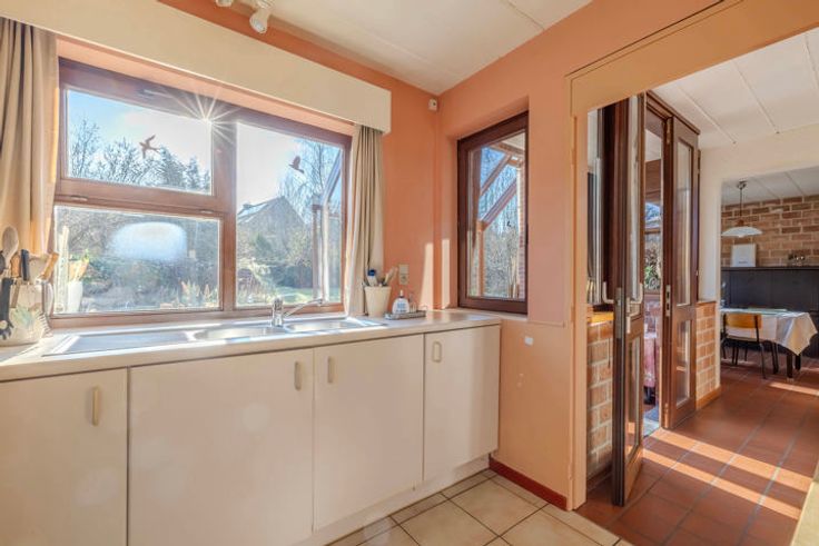 Indeling: inkomhal; apart toilet; volledig geïnstalleerde keuken voorzien van de nodige toestellen; achterliggende berging; afgesloten veranda met zicht op de tuin; lichtrijk woongedeelte met veel glaspartijen opgedeeld in eetruimte, zitruimte (mogelijkheid tot maken van een open haard) en ontspanningsruimte (mogelijkheid tot maken van bureau).