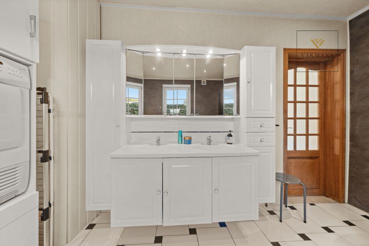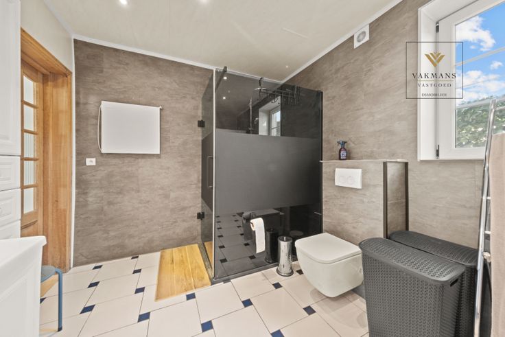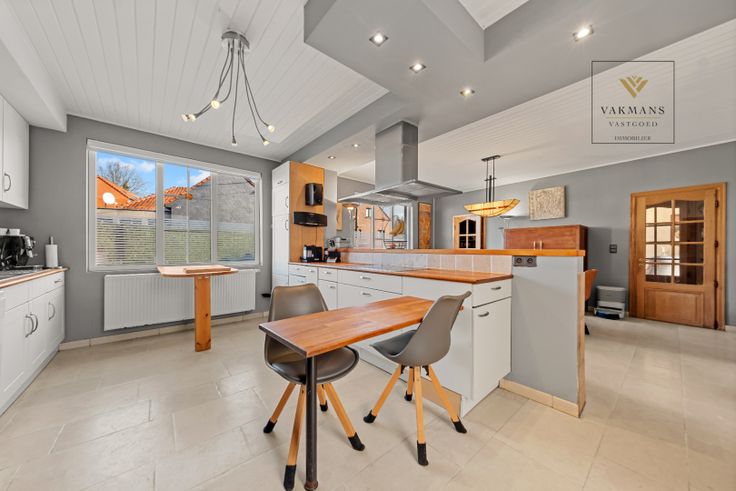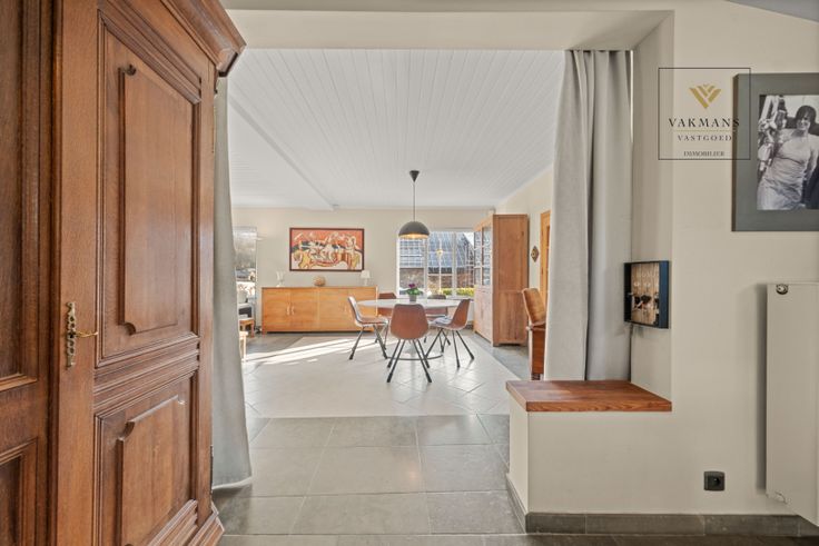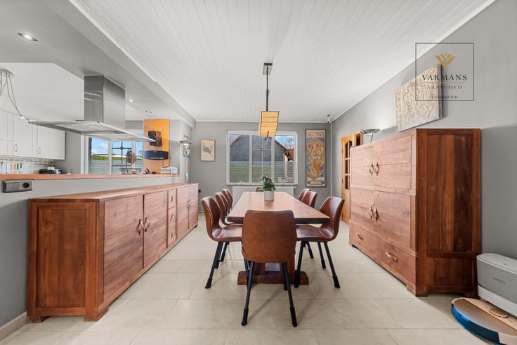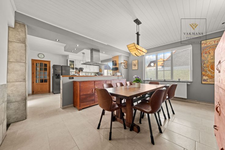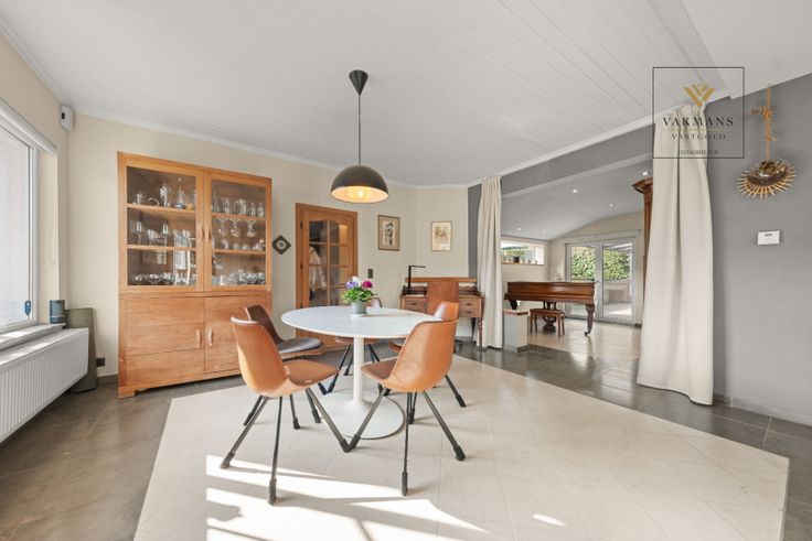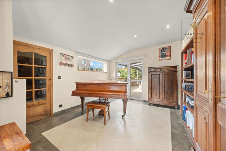 Indeling gelijkvloers van 150 m²: inkomhal met vestiaire en apart toilet, grote open leefruimte met zithoek, eetkamer en extra ruimte (voorlopig piano ruimte). Aansluitend de open keuken in connectie met de overdekte terras (nieuwe overkapping). Naast de keuken de badkamer met inloopdouche, toilet en dubbele lavabo. De wasplaats is hier ook perfect in verwerkt.
