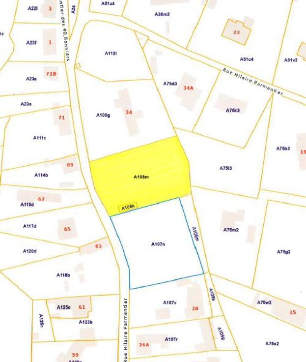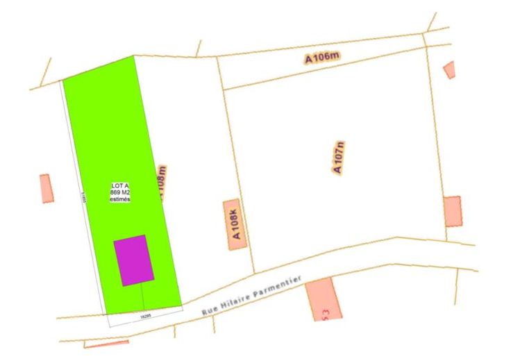 Terrain en zone constructible (lot A) sis rue Hilaire Parmentier, entre les numéros 28 et 34, d'une superficie d'environ 8 a 69 ca (la superficie sera précisée par un mesurage). Façade: +/- 16 m. Profondeur droite: +/- 52 m. Profondeur gauche: +/- 49 m. Libre d'occupation. Equipements et prescriptions urbanistiques: s'adresser à la commune de Braine-le-Château.