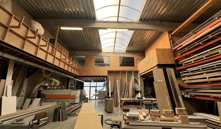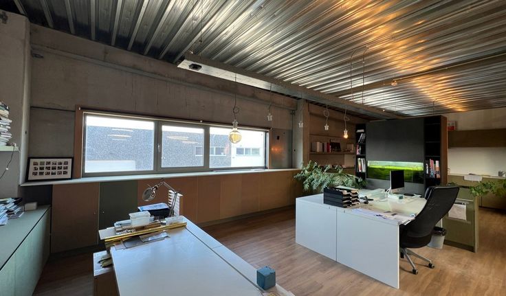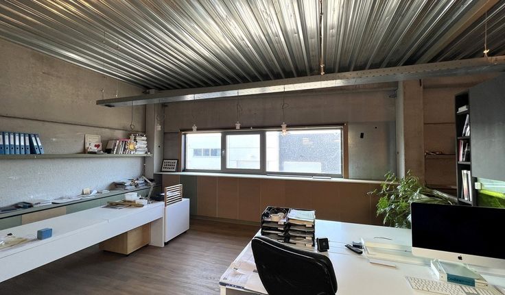 Specificaties: betonstructuur, aluminium schrijnwerk met dubbele beglazing, vrije hoogte: 6m, 1 automatische sectionaalpoort 4m x 4m, geïsoleerd steeldeck dak met centrale lichtstraat, opbouw tl-armaturen, polybetonvloer, drijfkracht, telenetaansluiting, kantoor met keuken, toilet en douche