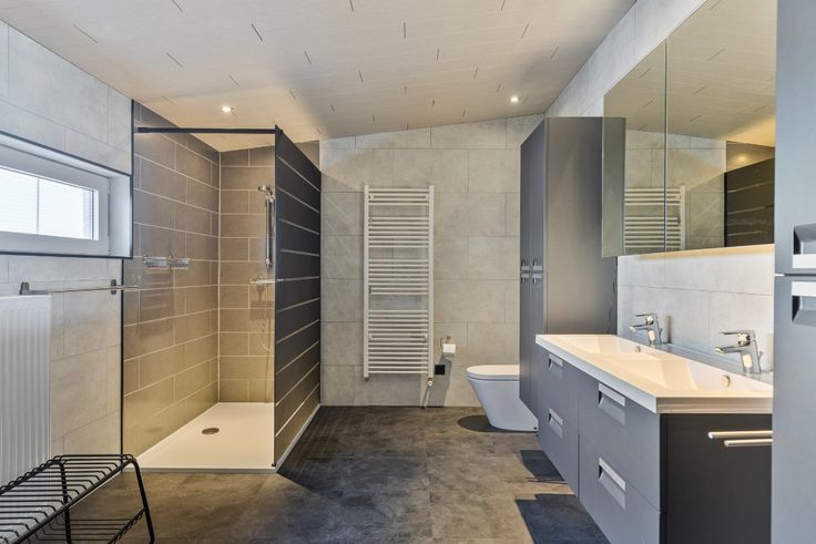 Eerste verdieping: 2 slaapkamers, kinderkamer/bureau en badkamer (inloopdouche, dubbele wastafel in meubel, ligbad en toilet).