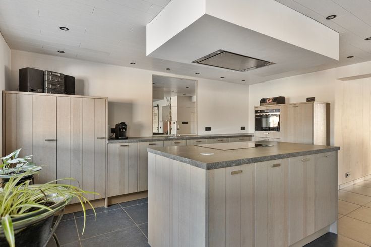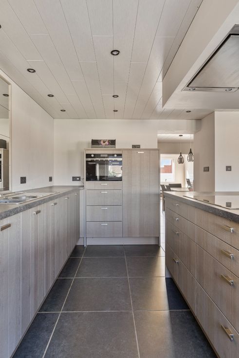 Gelijkvloers: inkomhal, woonkamer, eetkamer, open keuken (inductiekookplaat SMEG, combi oven, koelkast, vaatwasser,...) en leefruimte. Aansluitend is de berging met gastentoilet en de inpandige garage.
