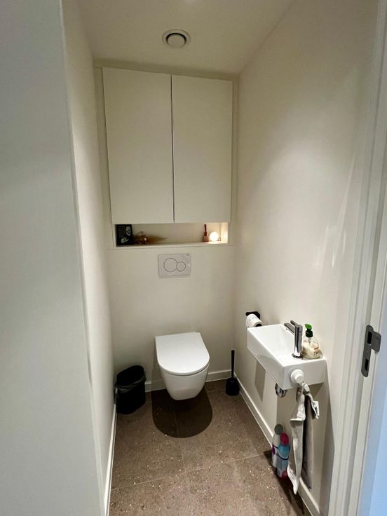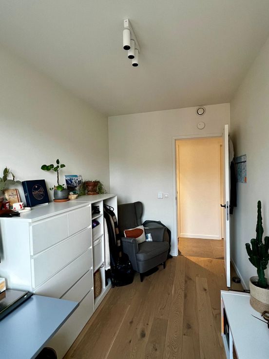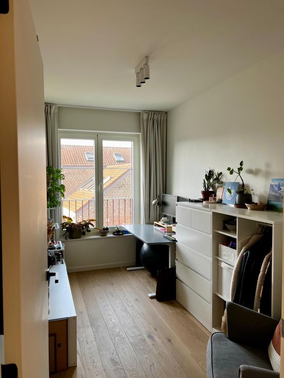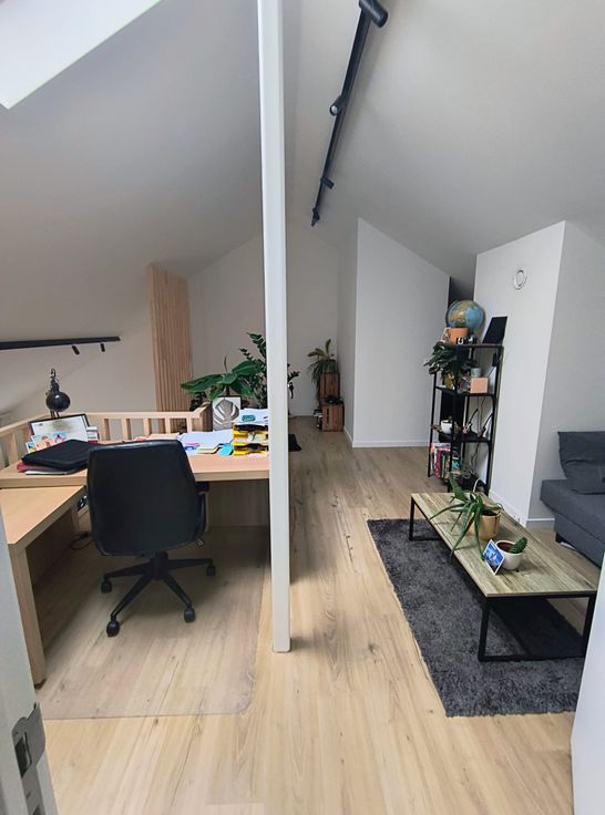 Ook op de mezzanine is er naast de tweede badkamer met ligbad/douche, wastafel nog een bergruimte, en vind je voorbij de multifunctionele ruimte (buro/zithoek/speelhoek/sport) de derde slaapkamer.