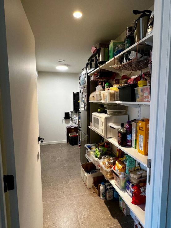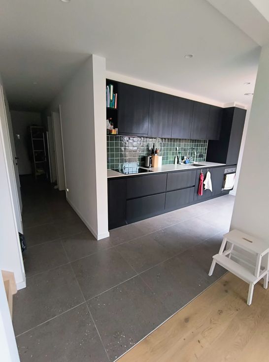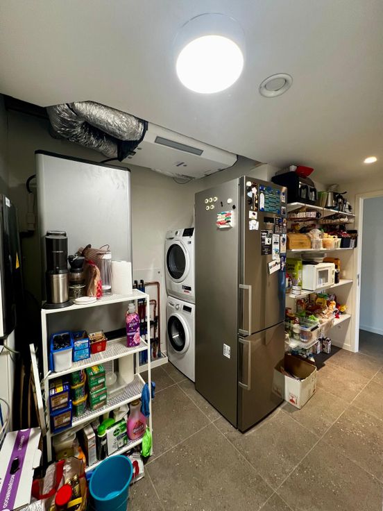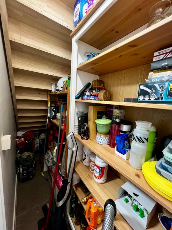 Vervolgens de volledig ingerichte keuken (frigo/ijskast, vaatwasser, inductievuur) en rechts zeer grote bergruimte waar ook wasmachine en droogkast kunnen staan.