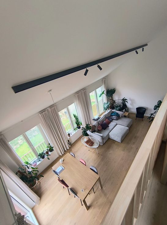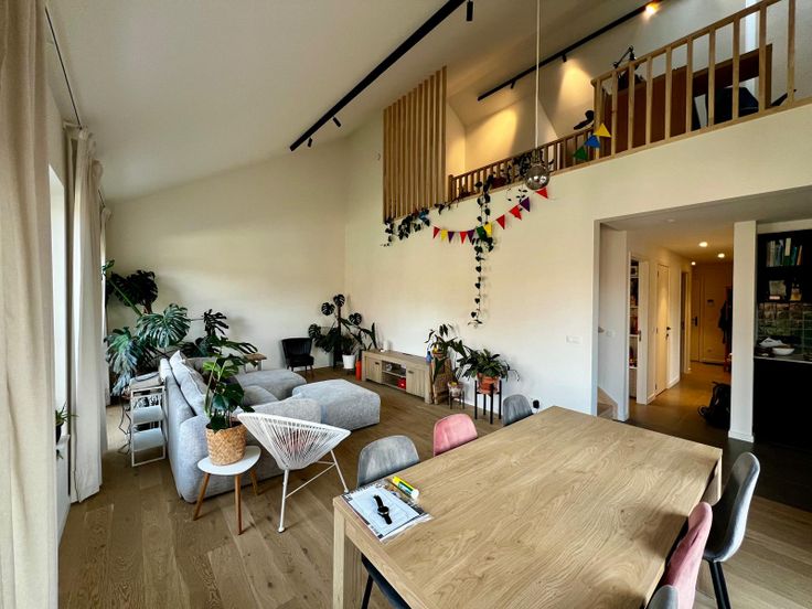 De hoge plafonds en mezzanine benadrukken het gevoel van ruimte.