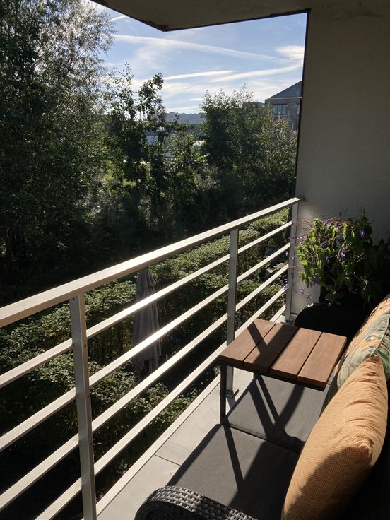 Binnenkomen doe je via de inkomhal met aan je rechterkant een apart toilet met wasbaskje en een berging waar je een aansluiting hebt voor je wasmachine. De lichtrijke leefruimte omvat een geïnstalleerde keuken met recent vernieuwde toestellen (frigo, keramische kookplaat, dampkap, vaatwasser en oven) en een ruime living met parket waar je veel lichtinval hebt dankzij het grote schuifraam. Van hieruit heb je toegang tot het gezellig terrasje uit tropisch hardhout dat uitkijkt op Lousbergspark maar geen directe inkijk heeft van andere appartementen.