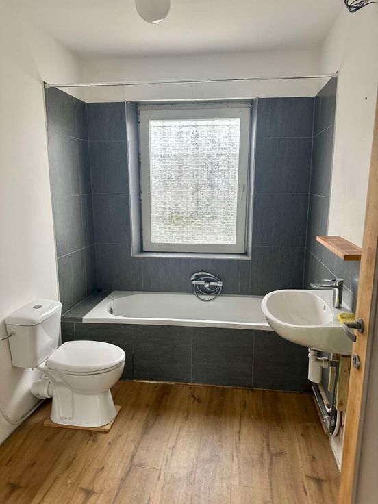 Salle de bains neuve : Entièrement équipée d’une baignoire, wc, évier.