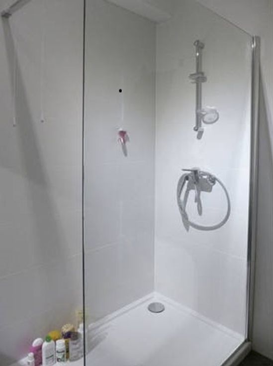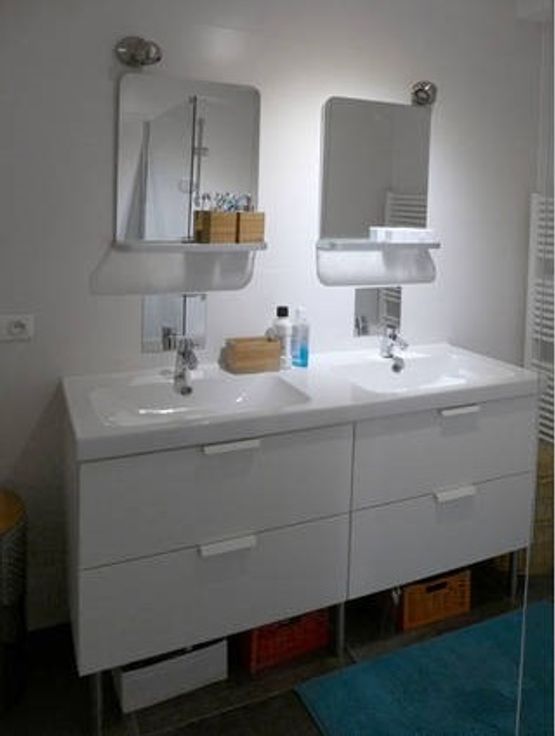 De badkamer heeft twee lavabo's en inloopdouche. Het toilet is apart.