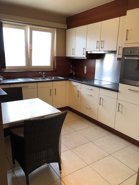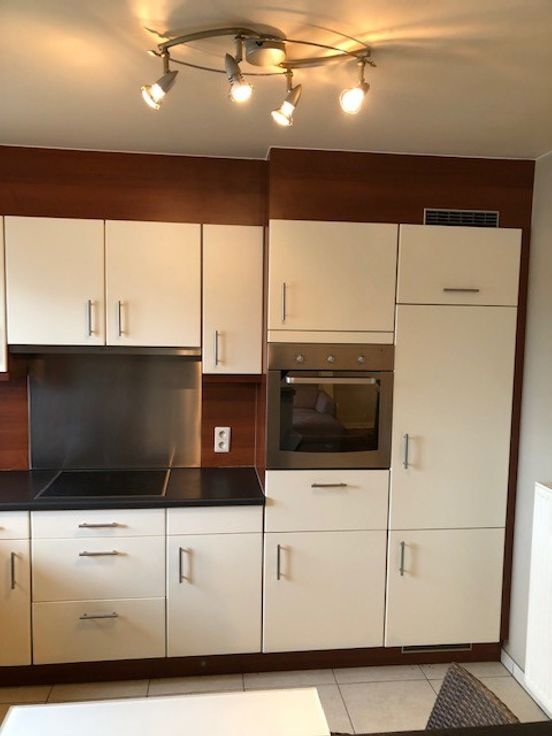 Het appartement is gelegen op de eerste verdieping. Je komt binnen in een inkomhal van waaruit alle ruimten bereikbaar zijn. Een ruime leeftuimte in L-vorm met een groot schuifraam dat uitgeeft op een terras aan de achterzijde van het gebouw. Een halfopen keuken met ingebouwde frigo, oven, keramische kookplaat, dampkap en afwasmachine. Er is een badkamer met zowel een bad als een afzonderlijke douche. Een apart toilet. Een ruime berging en 2 ruime slaapkamers. Verder is er een zeer ruime garage achter het appartementsgebouw.