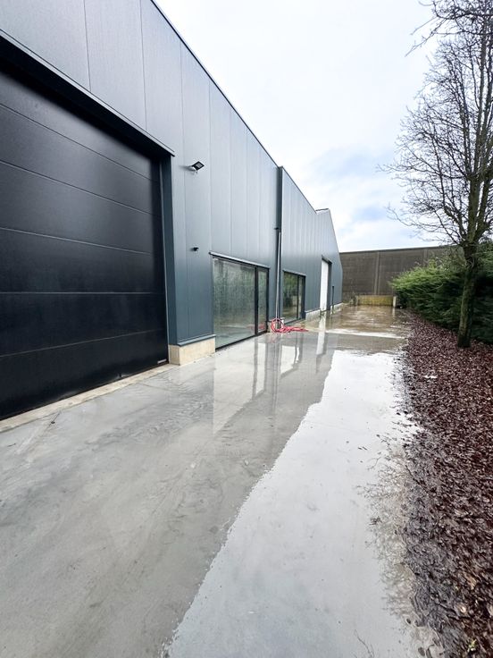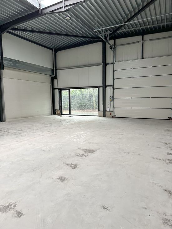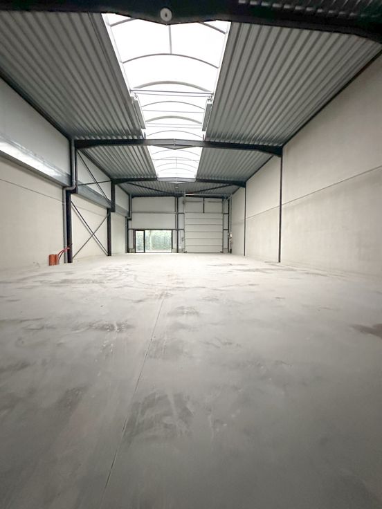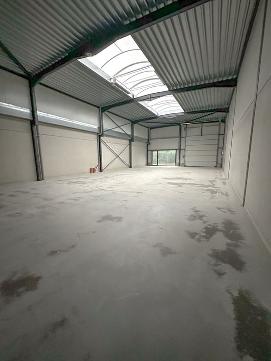 Loods te huur in het indsutriepark SCHATTING - De loods is voorzien van een sectionaal automatische poort en inkomdeur met groot raam. Het bedrijfspand kan dienst doen als magazijn voor opslag, uitbating van industriële of ambachtelijke activiteiten, alsook dienstverlenende activiteiten. De vloer is bekleed met polybeton.