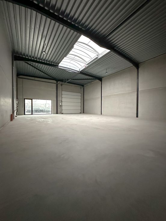 Loods te huur in het industriepark SCHATTING - De loods is voorzien van een sectionaal automatische poort en inkomdeur met groot raam. Het bedrijfspand kan dienst doen als magazijn voor opslag, uitbating van industriële of ambachtelijke activiteiten, alsook dienstverlenende activiteiten. De vloer is bekleed met polybeton.