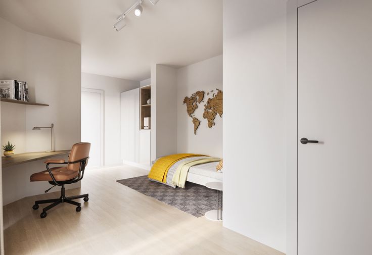 - Volledig bemeubeld: elke kamer is voorzien van een kleerkast, gordijnen, boxspring (exclusief matras), bureau met bureaustoel en een ontbijthoek met eigen koelkast