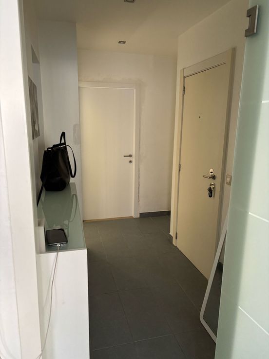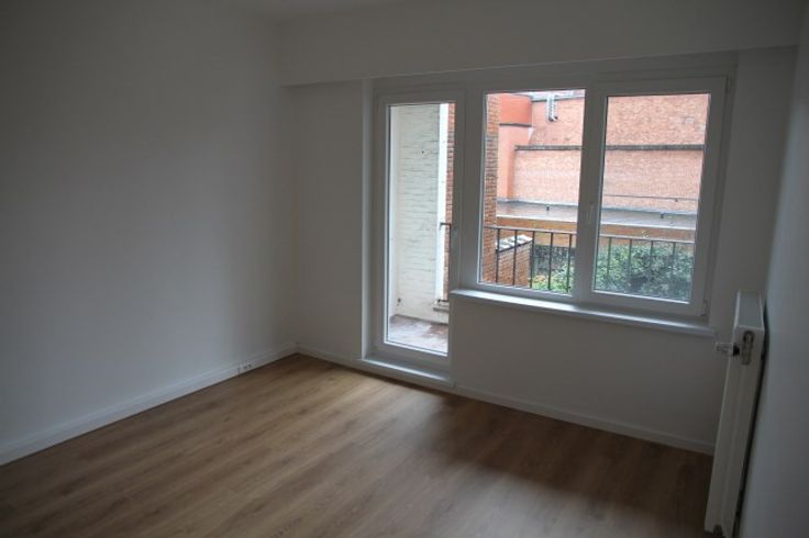Appartement met: Hal, vestiaire, uitgeruste keuken met inductievuur, dampkap, vaatwasser, spoelbak, warme lucht oven, living, nachthal, WC, badkamer met douche, 2 slaapkamers met achterterras en zicht op groen, kelderberging.