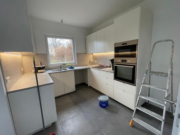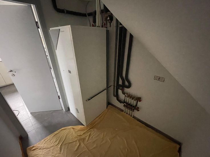 Au rez-de chaussée : hall d'entrée avec une toilette et des armoires. Un pièce de vie spacieuse avec cuisine ouverte + une buanderie.