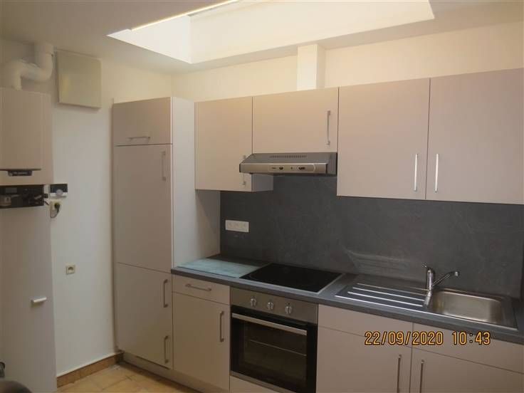 rez-de-chaussée : séjour (+/- 30 m²) ouvert sur la cuisine - évier simple bac taque vitrocéramique hotte four frigo - WC séparé