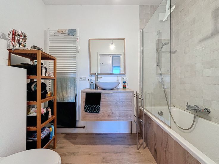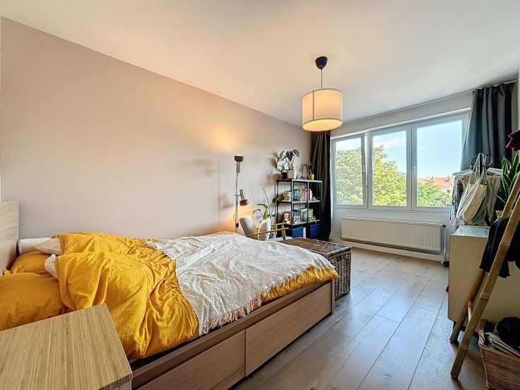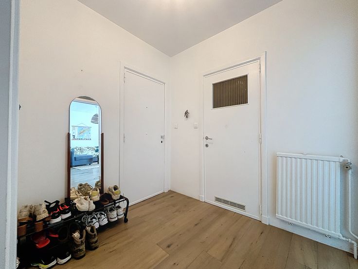We wandelen het appartement binnen via de ruime inkomhal met opbergkast voor jassen en schoenen. Aan de voorzijde bevinden zich de open, uitgeruste keuken met wasmachine (inbegrepen) en lichtrijke leefruimte, waar plaats is voor een eetplaats en zithoek. De badkamer beschikt over een ligbad, lavabo, wc. Aan de achterkant van het appartement vinden we de twee ruime slaapkamers met toegang naar het terras.